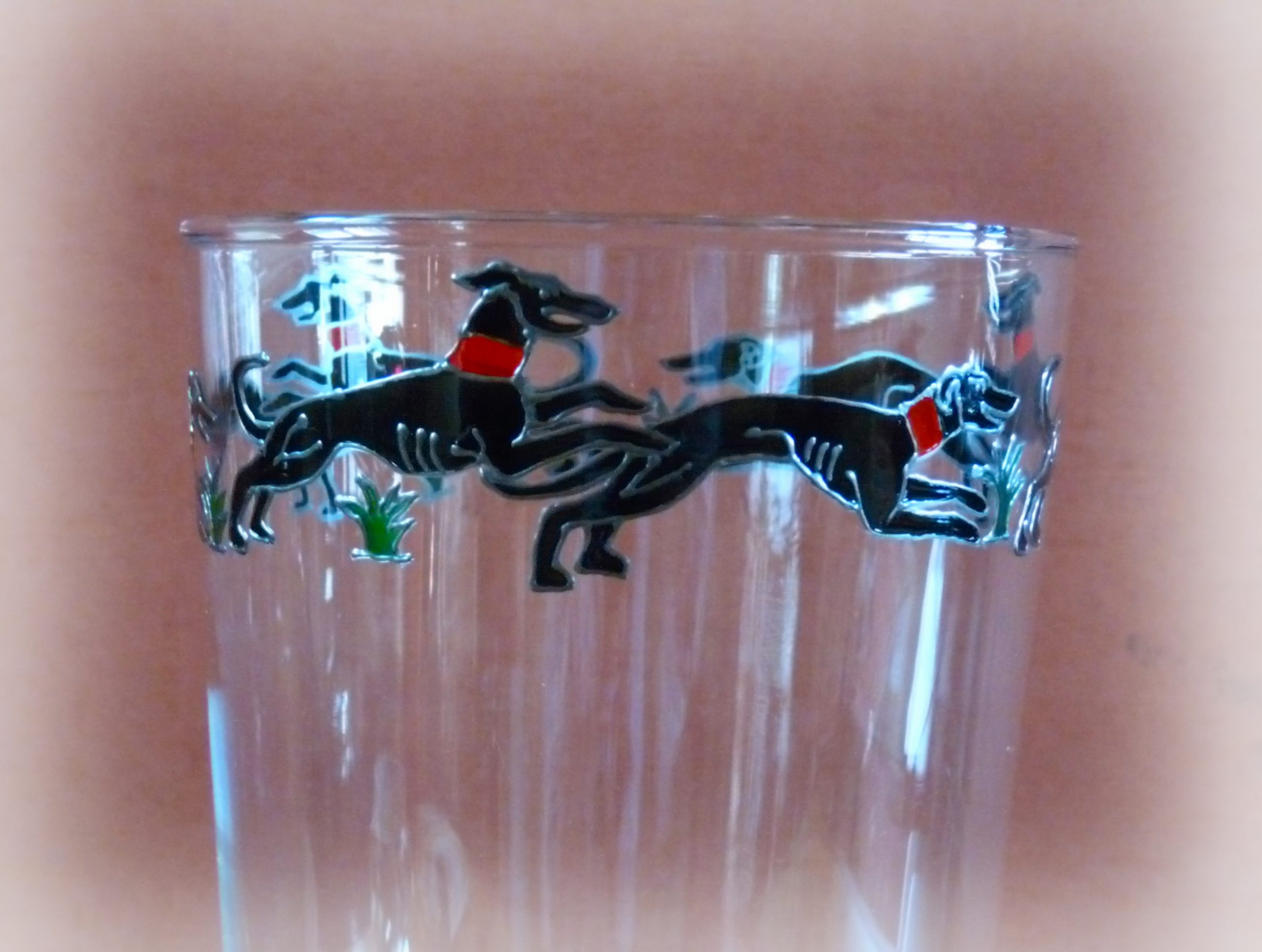 We can draw and paint an animal portrait from a photograph, and have made glasses, plaques, suncatchers and candleholders, even as remembrance/memorial pieces. This is a greyhound suncatcher of our own greyhound Sammy.. |