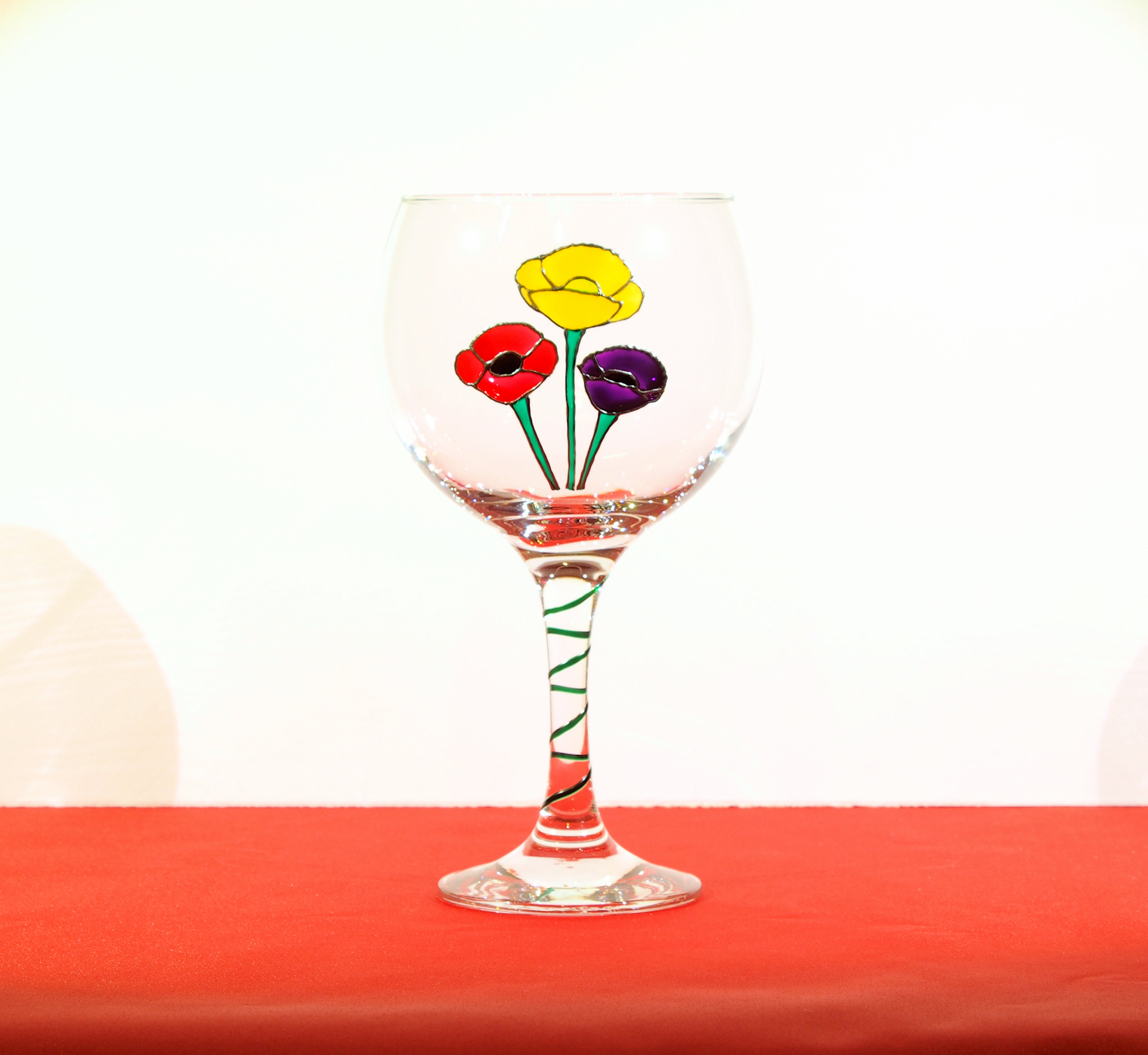 3 Poppies – Red for Remembrance, Yellow for Wales and Purple for the Animals. Beautiful hand-drawn and hand-painted design on a stemmed gin glass ( 63 cls). Bowl 10cms high, 11cms wide, glass overall 20cms high. Also suitable as a large wine glass.