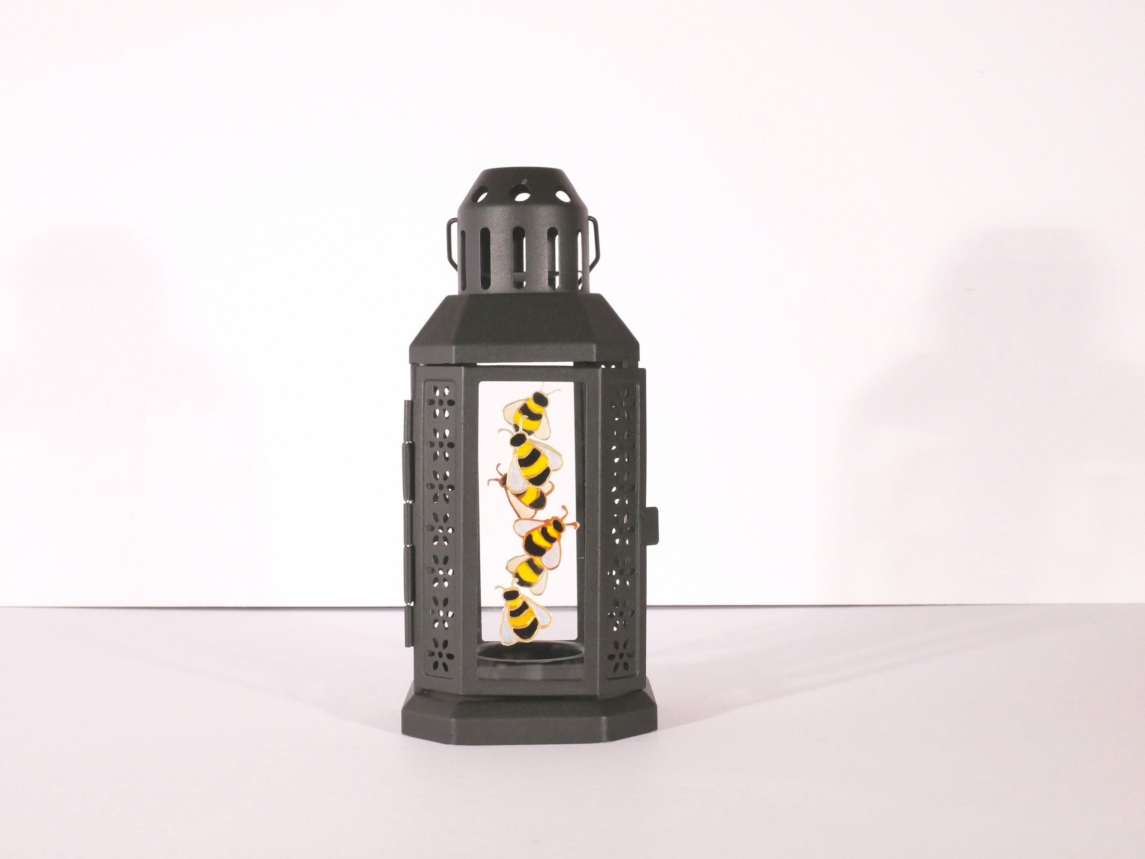 This is a steel (powder coated) and glass Morroccan style lantern, 22cms tall, each of the 4 glass panels has 3 beautiful Bees hand drawn and painted on them by us and lined in gold liner. Can be used indoors or out with a tea-light or candle (not supplied). Absolutely stunning! Available in Black or in Stone colour – this is the black version.