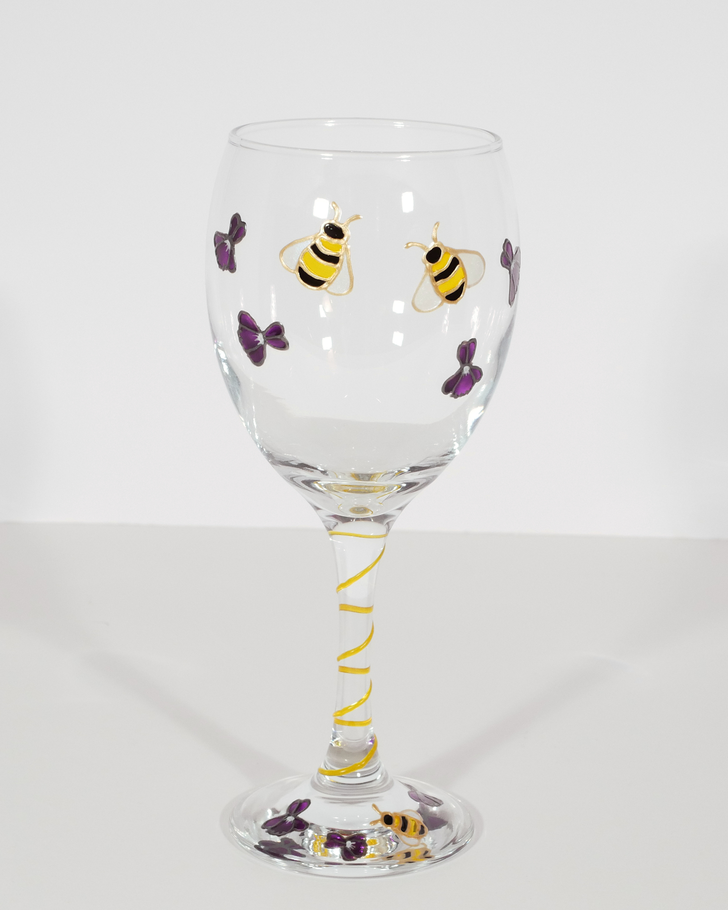 Beautiful hand-drawn and hand-painted Bees and Violets design on a wine glass, with yellow line around the stem. Glass is 19.5cm tall, bowl 7.1cm diameter, 35cls capacity. Each one hand-drawn and painted by us here in Clydach, Wales, baked to be dishwasher safe to 40 centigrade but we would always recommend hand-washing. For US/Canada/EU/Australian postage please message us for price.
