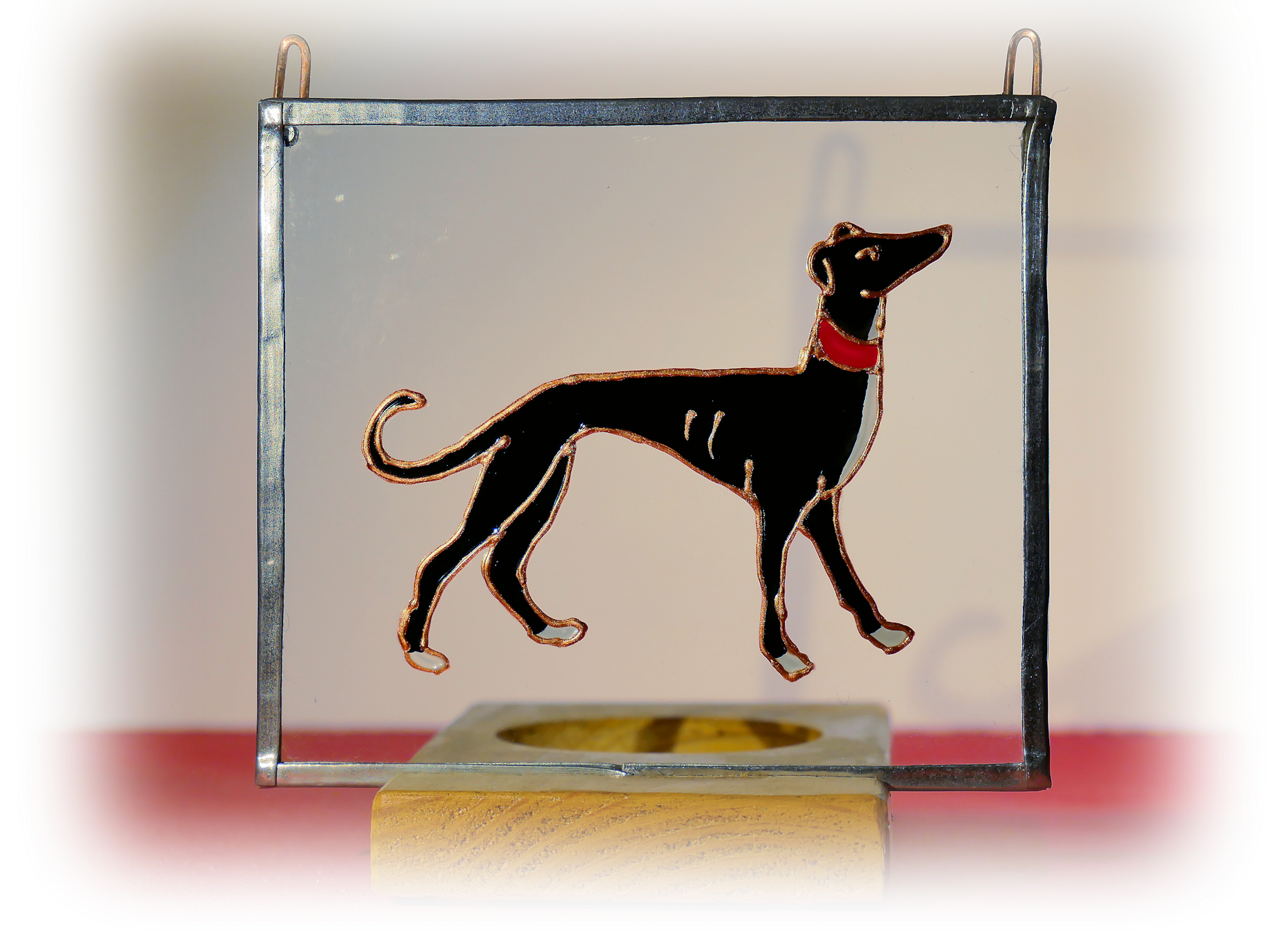 A beautiful hand-drawn hound (greyhound/Galgo/lurcher) based on a medieval drawing on a 5 “x 4” suncatcher. It is leaded, soldered and strung by hand, and makes a beautiful suncatcher/wall-plaque. A lovely hound decoration – also available in other colours. Price includes First Class UK postage. For US/Canada/Australia or European Postage see US/Canada or European versions..