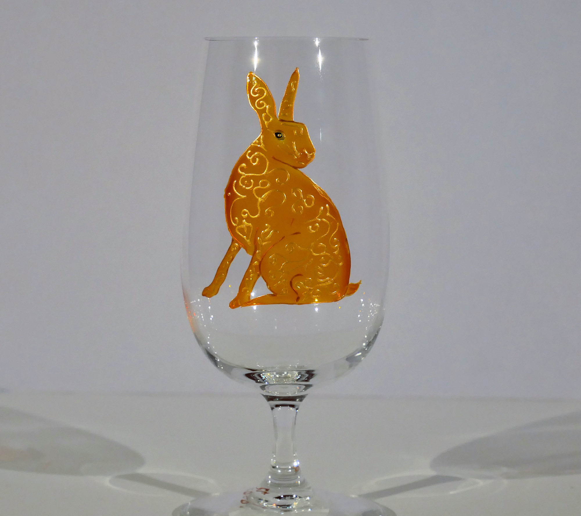 A beautiful, shapely glass, and a beautiful design, each one hand-drawn and hand painted by us, as all our work is. This one is of a beautiful Hare with a celtic swirled pattern, in copper and gold. Also available as a Welsh Dragon, 3 Feathers, Owain Glyndwr and Beer Happy. Each glass is 18.5 cm high, and holds 48cl.