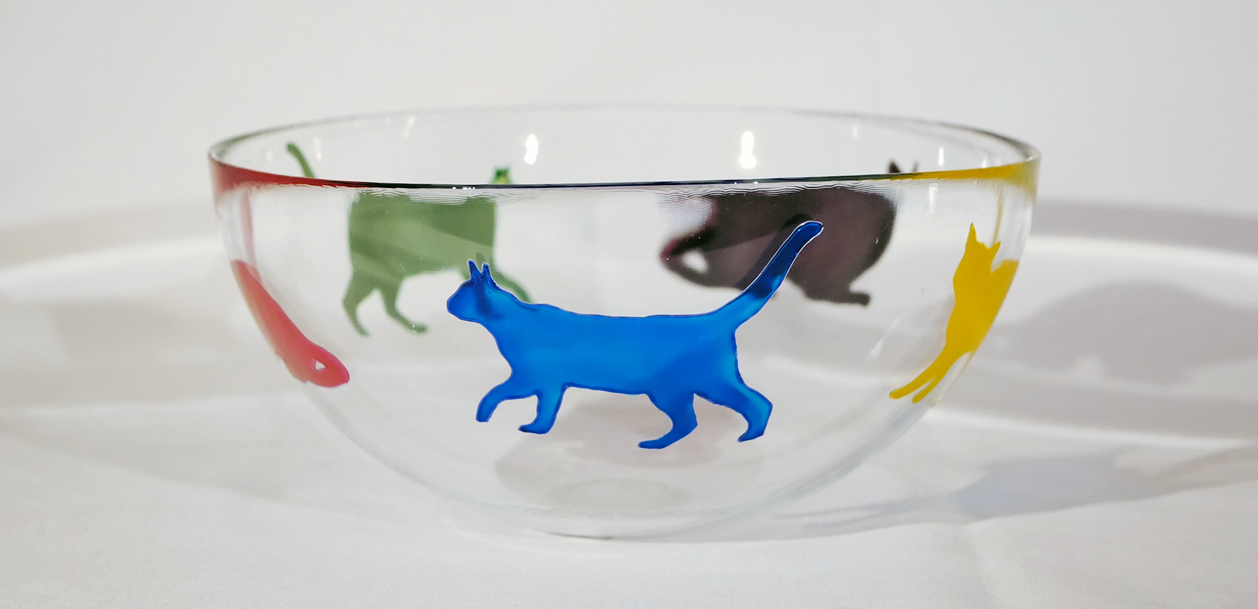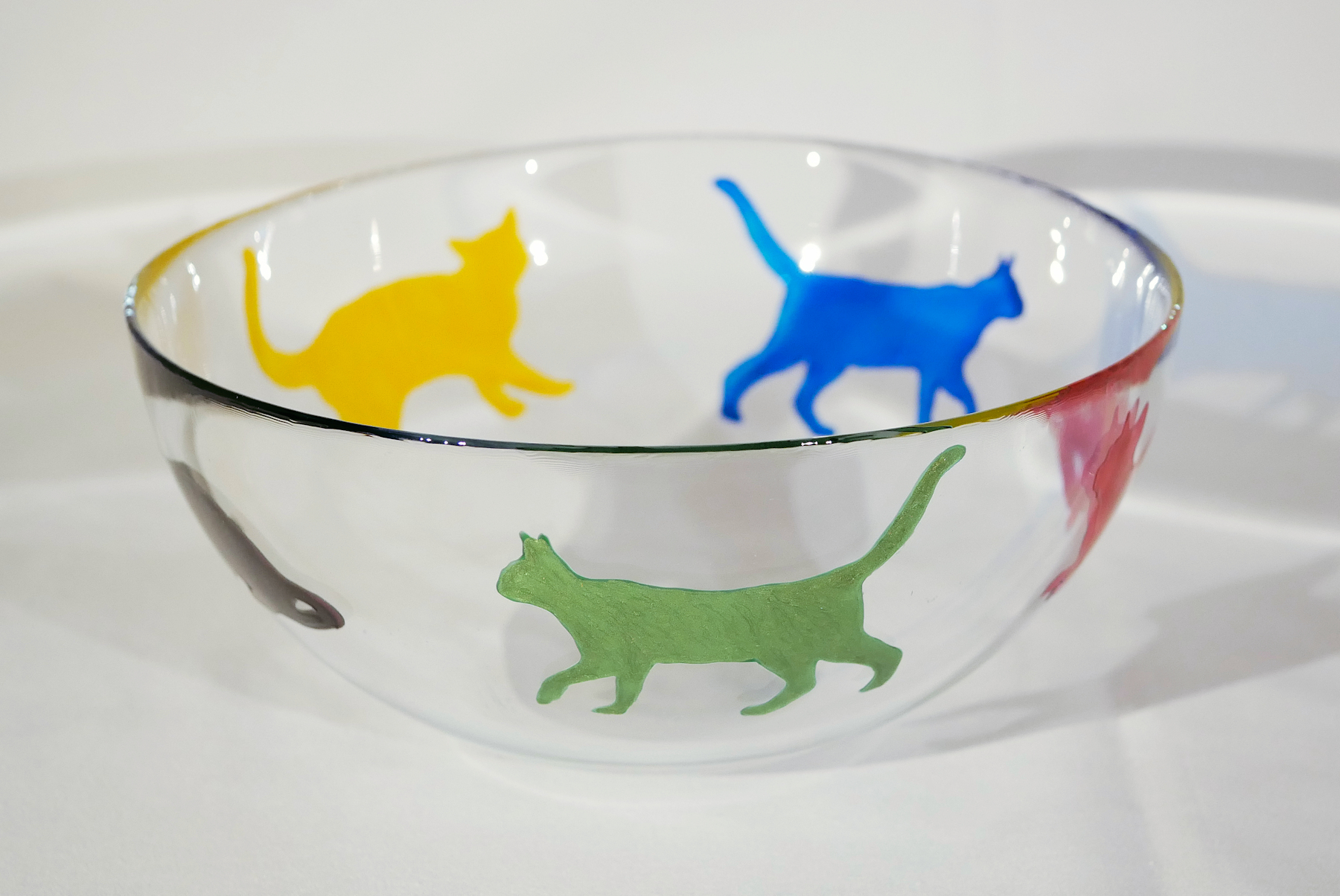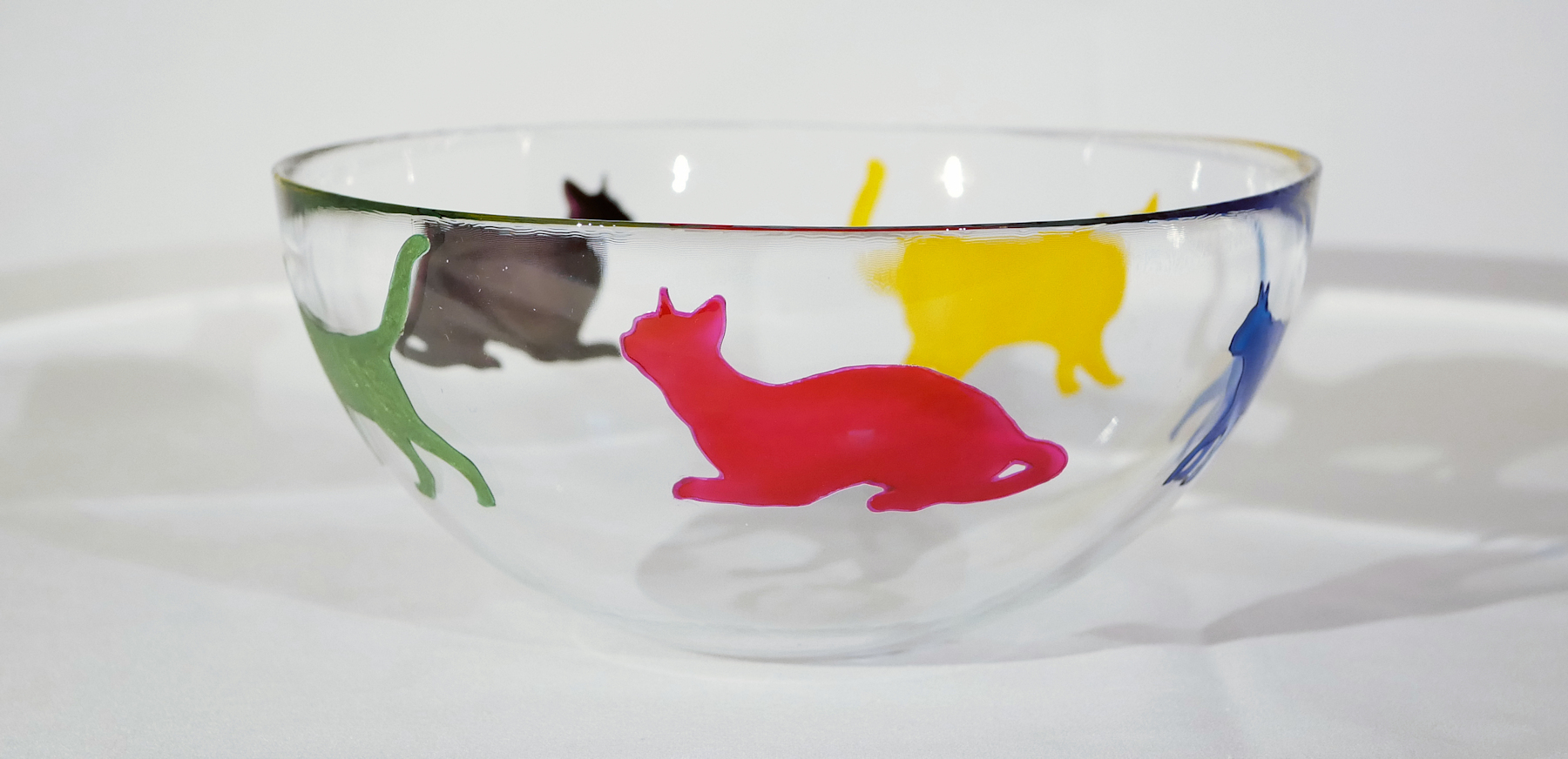 This is a beautiful hand-painted glass fruit bowl with a series of colourful cat silhouettes around it. Each bowl has 5 cats individually drawn and painted, and then baked to make them dishwasher proof up to 40 degrees celsius – but we would always recommend hand-washing. Absolutely stunning when they catch the light. A must for any cat lover! This is the price for UK postage – also available for overseas postage – just message us for an up to date postage price. The bowl is 20 cms in diameter.