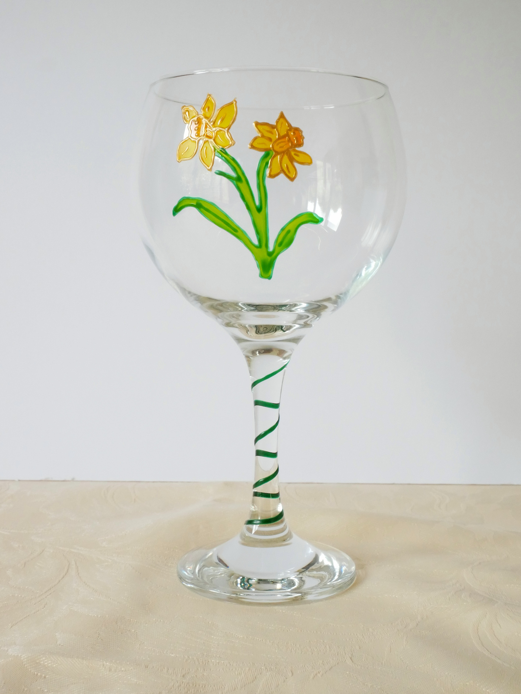 Beautiful hand-drawn and hand-painted Welsh Daffodil/Narcissus design on a stemmed gin glass ( 63 cls), with greenline around the stem. Bowl 10cms high, 11cms wide, glass overall 20cms high. Also suitable as a large wine glass.