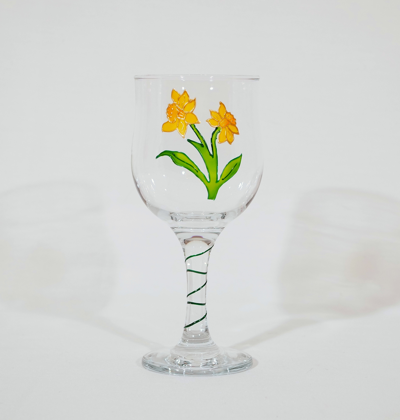 A gorgeous Stemmed Daffodil/Narcissus design hand drawn and painted on a fantastic, stylish tulip shaped wine glass. The national flower of Wales, each one is a wonderful piece of artwork. (Also available as a wine glass, gin glass, stemmed gin glass, glass coffee mug or tumbler). The glass is baked to be dishwasher safe to 40c but we would recommend hand-washing.