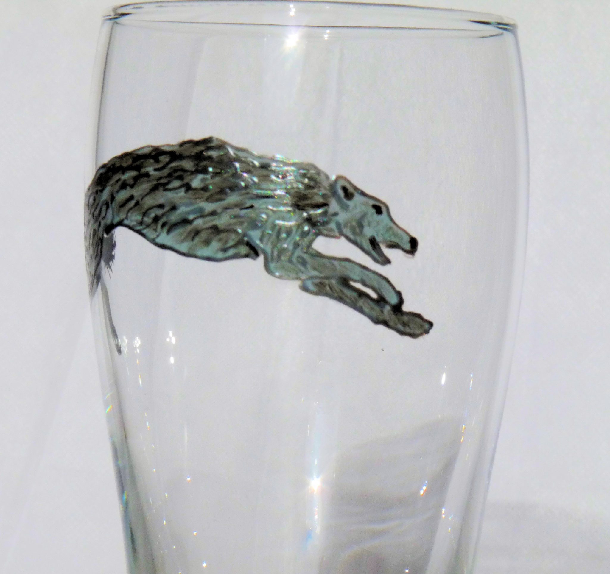 A hand-drawn organic deerhound design on a pint glass. A must for any deerhound fan – they would love to drink their beer/shandy or even coke out of this fabulous mug. A wonderful piece of individual artwork – each one is hand-painted and textured to illustrate the deerhound’s shaggy coat and the movement of the running dog.