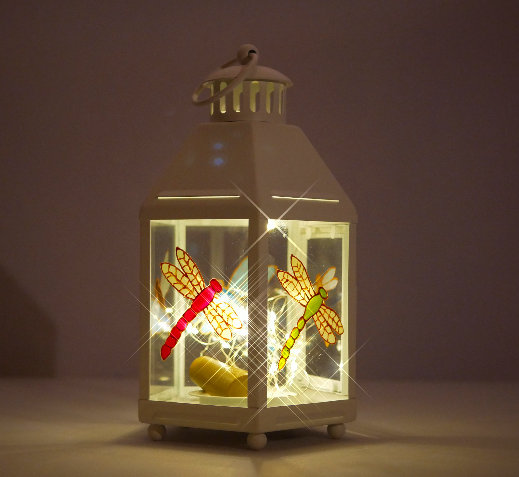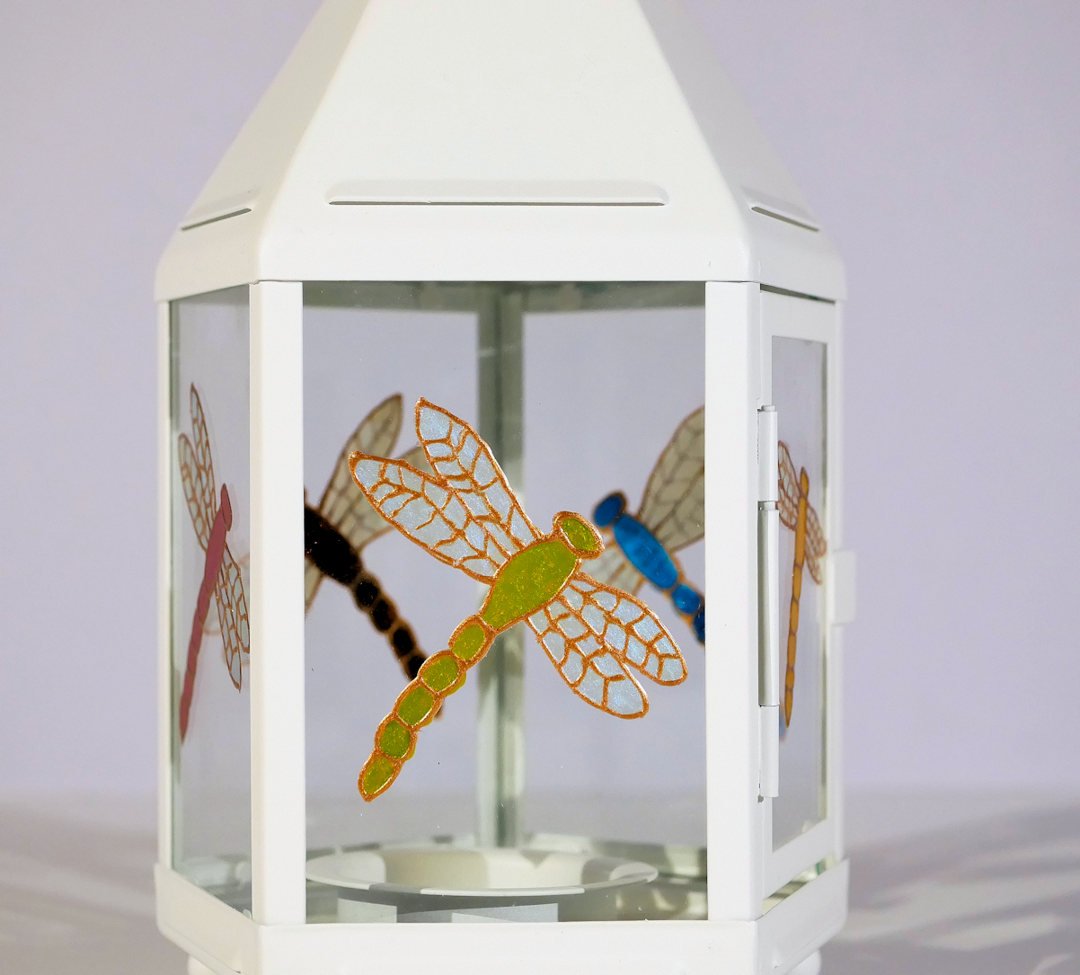 This is a steel (powder coated) and glass lantern, 20cms tall, each of the 5 glass panels has colourful dragonflies hand drawn and painted on them by us and lined in copper liner. Can be used indoors or out with a tea-light or candle (not supplied). Absolutely stunning! Available in charcoal or in white colour – this is the white version.