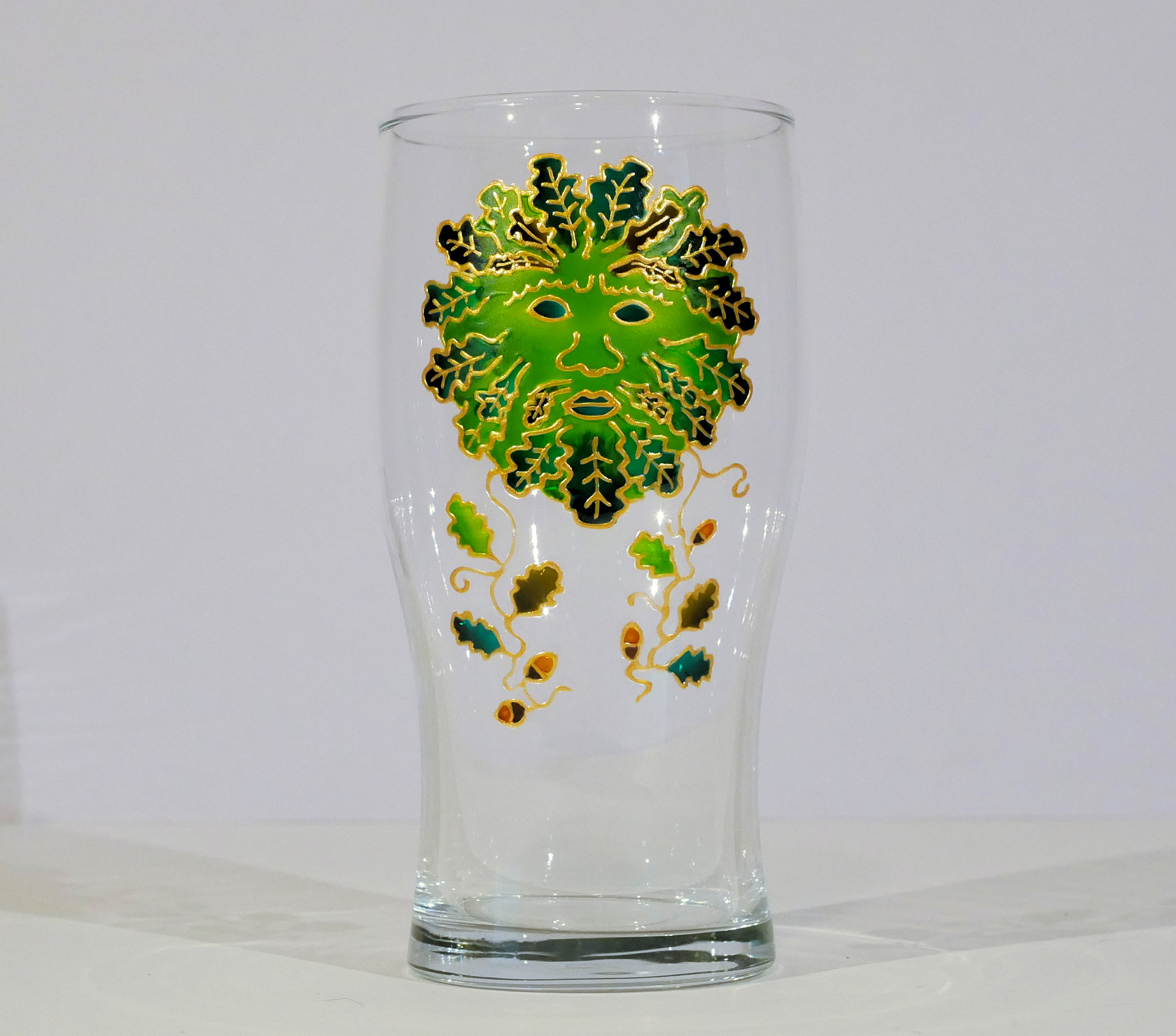 The wonderful spirit of the woodland, this Green Man pint glass is an impressive piece of artwork – the perfect gift for a beer lover, or for a cider lover! Everyone is individually hand drawn and painted, and has been oven-baked and to be dishwasher safe to 40 centigrade but we would always recommend hand-washing. This is the price including UK postage and packing for a single glass. If you would like more than one, contact us for a more accurate price.