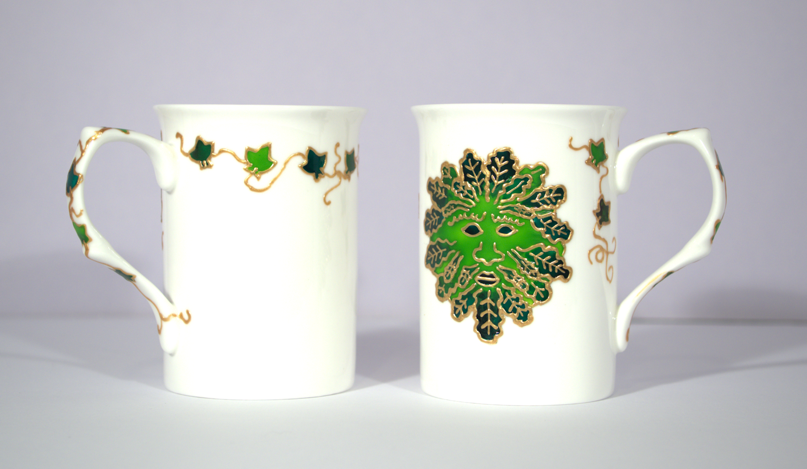 A hand-drawn and hand-painted Green Man design on a pair (2) of lovely heat proof bone china coffee/tea mugs. The garland of leaves wraps around the mug and along the handle, so they are wonderful pieces of individual artwork, each one hand drawn and hand painted in Clydach, Wales.