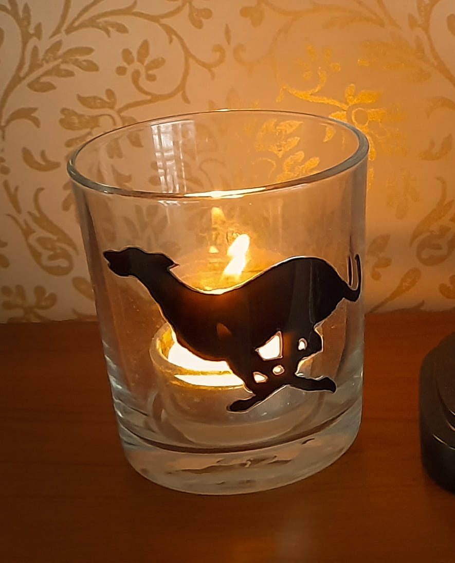 A glass with a running greyhound silhouette hand drawn and painted on it, which makes a beautiful candle holder (tealight provided). Price includes tealight and UK postage.
