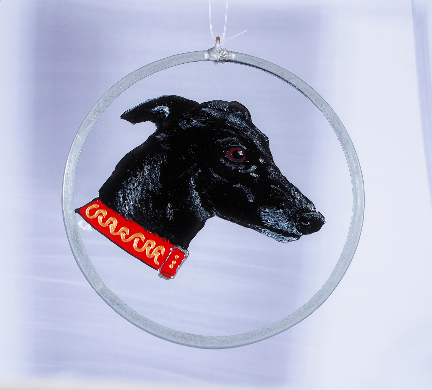 Hand drawn and hand painted Black Greyhound Suncatcher