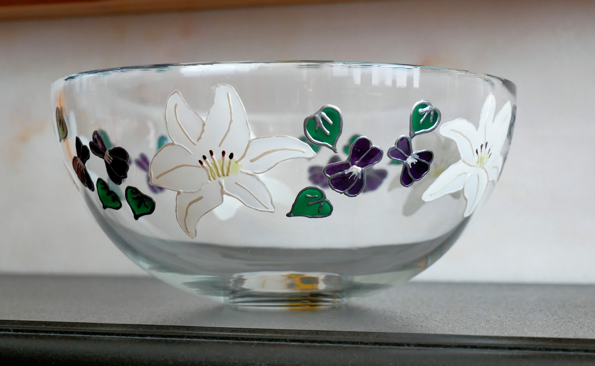 This stunning hand-painted glass fruit bowl has a beautiful lilies and violets design around it. Each 20 cm in diameter bowl has 4 lilies and pairs of violets individually drawn and painted, and then baked to make them dishwasher proof up to 40 degrees celsius but we would always recommend hand washing. An absolutely stunning piece of artwork.