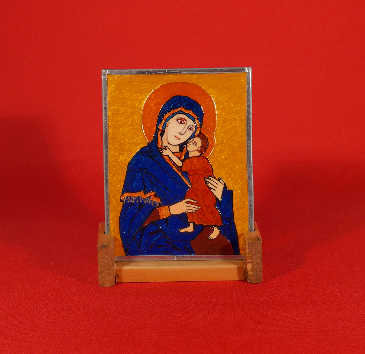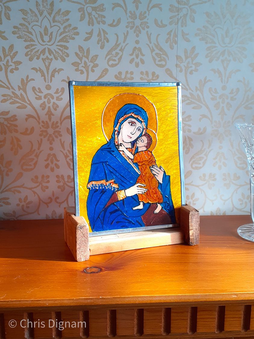 This Madonna & Child is inspired by a Byzantine original. It is 4″ x 5″, hand drawn and hand-painted on glass then leaded and set into a wooden base. Each colour is hand-blended, and the way the metallic hues catch the light is amazing to see. It is both a work of art, and a religious piece.