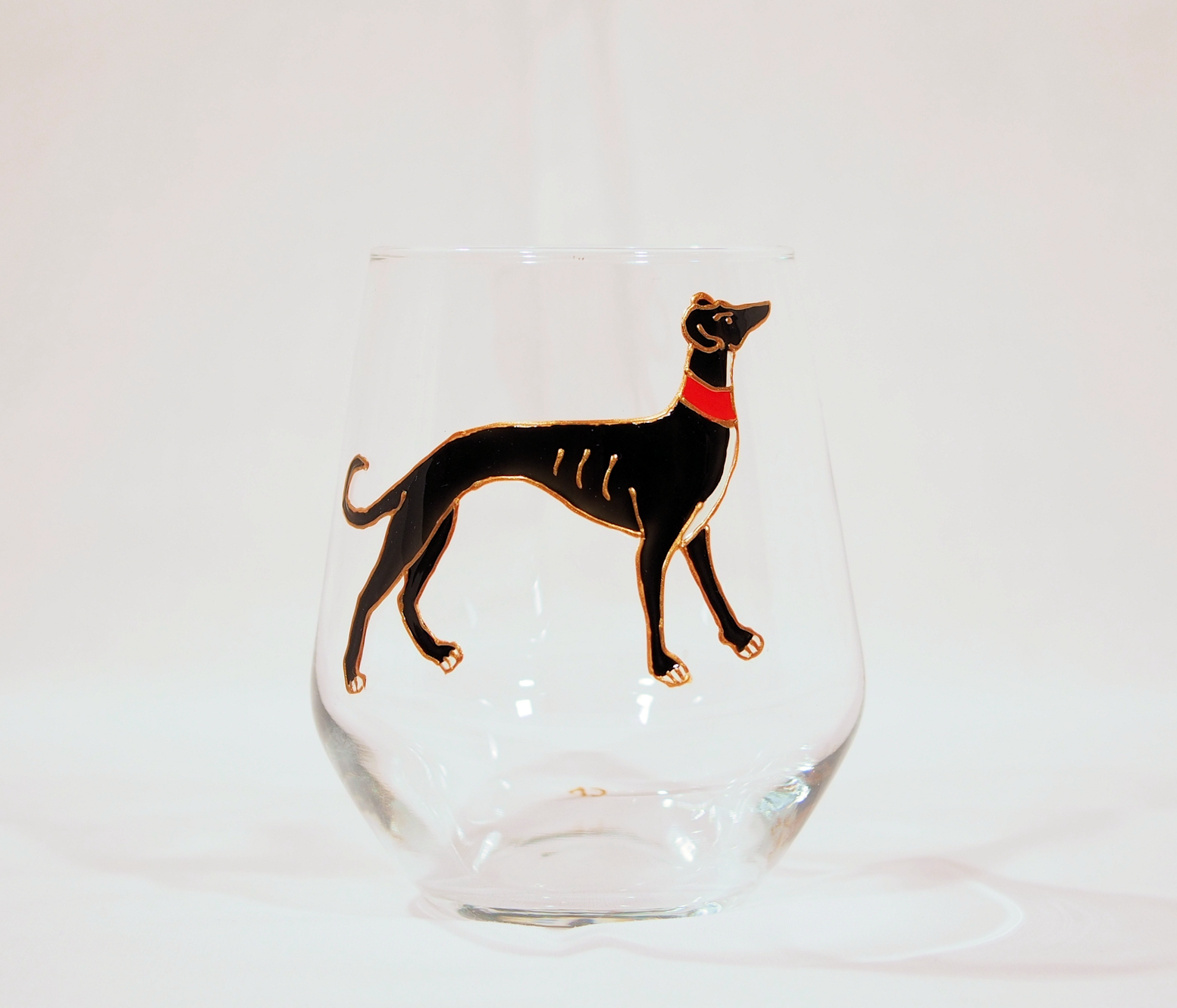 Beautiful hand-drawn and hand-painted Greyhound design (based on a medieval drawing) on a rounded gin glass ( 45 cls). 11 cms high. Available in black, white, fawn or blue. Also suitable as a rum, whiskey or spirits glass. We can export to US/Canada/Europe – please contact us for an accurate postage price.