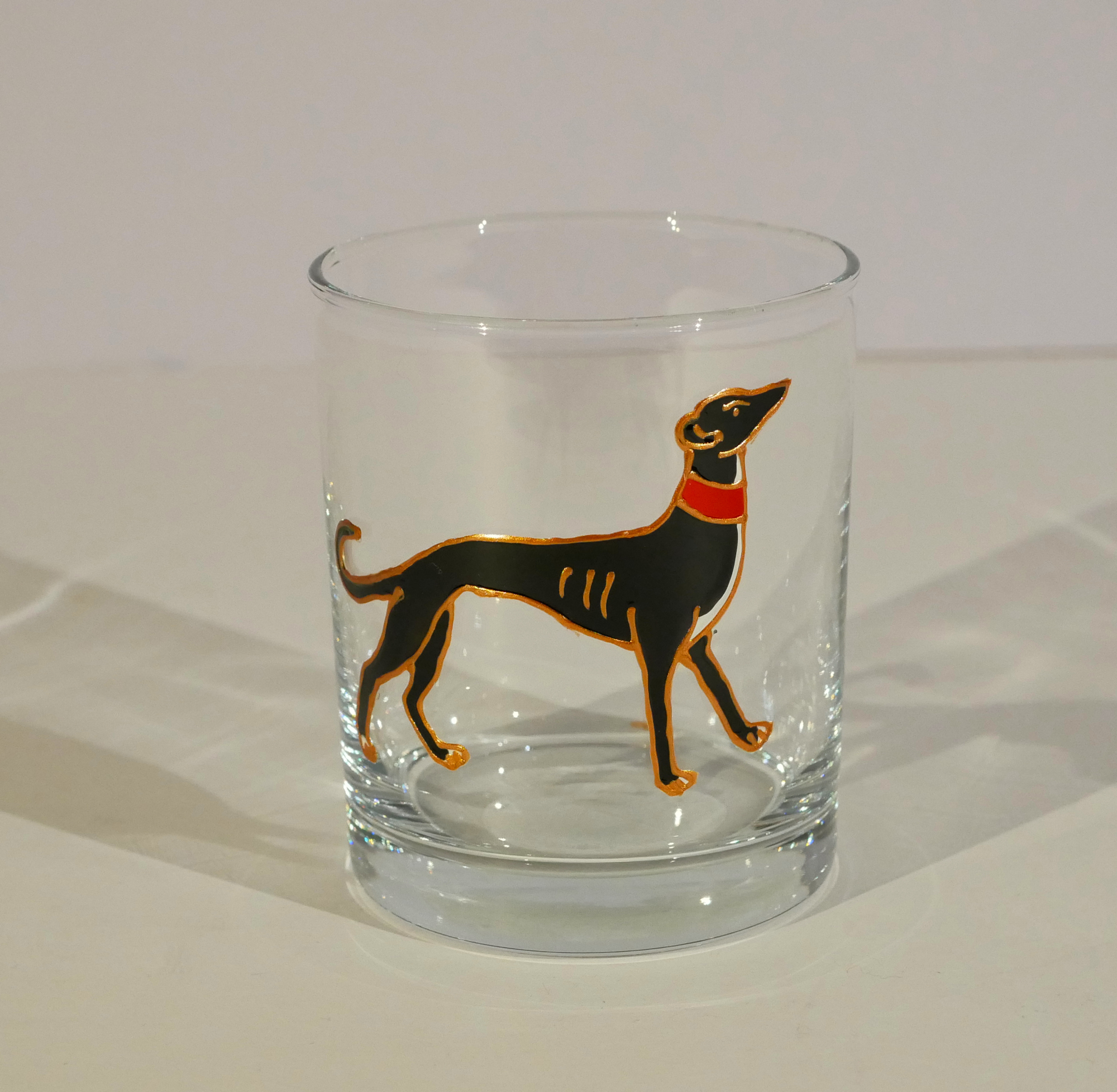 Gorgeous hand drawn and hand painted black medieval greyhound design on a glass tumbler. The glass is based on a medieval drawing. Capacity 23cls, 10cms high. Each one individually drawn and painted by us here in Clydach, Wales, and is a piece of art in itself. They are NOT transfers! The glass has been baked so that it is dishwasher safe to 40 centigrade, but we would always recommend hand washing.