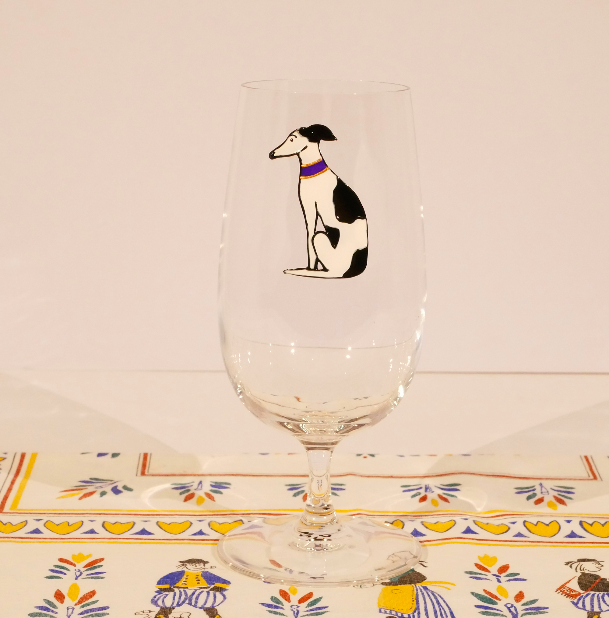 What a greyt gift for the greyhound owner – a hand-drawn black and white (cowdog) sitting greyhound design on a pilsner glass. A must for any greyhound or whippet fan. They would love to drink their beer/shandy/cider – or even cola – out of this fabulous glass (I think it works well with fizz in). A wonderful piece of individual artwork – each one is hand drawn and hand-painted by us here at Crafty Dog Towers.
