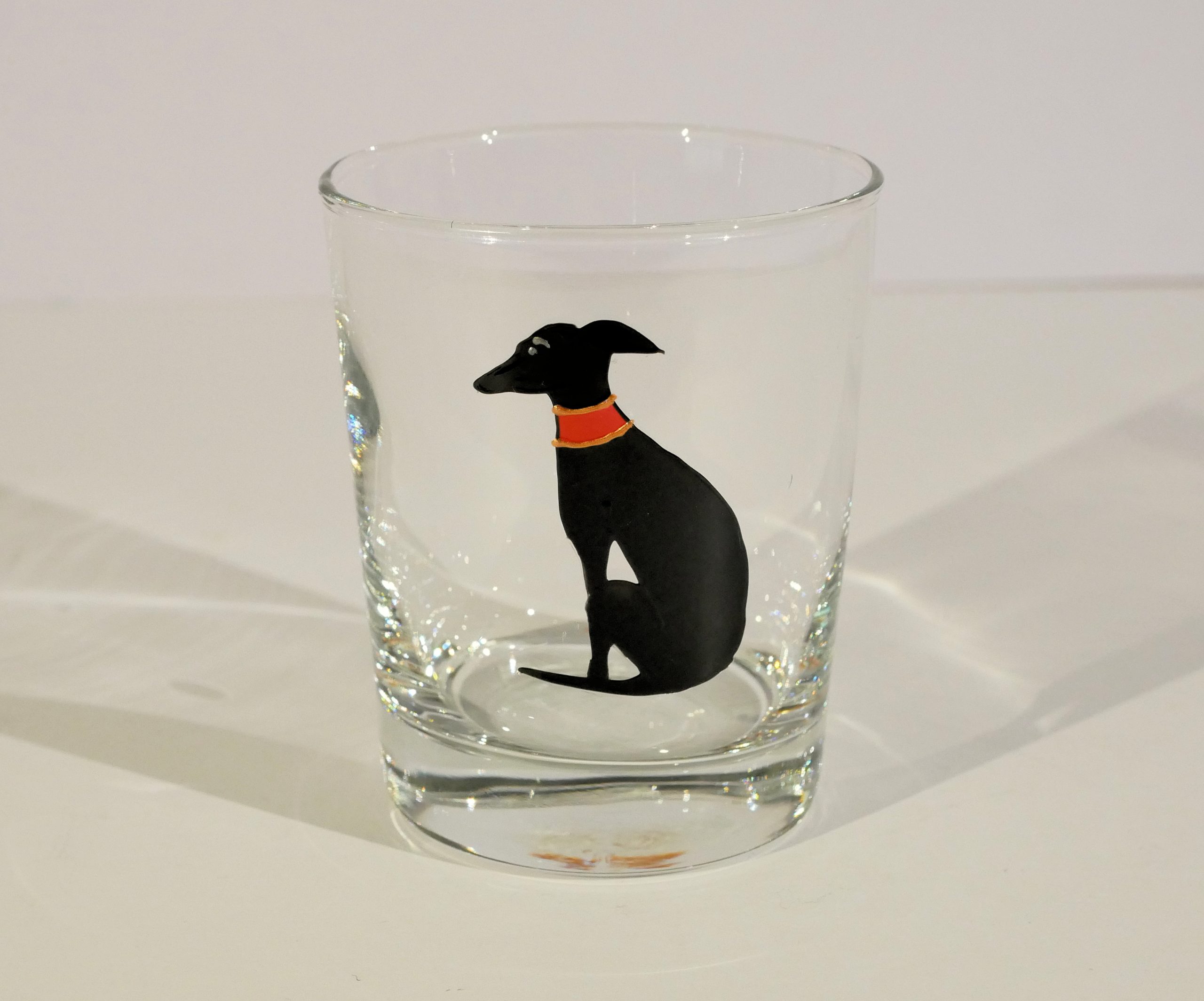 This is one of a range of sitting hounds, on tumblers, pint glasses, pilsner glasses, stemmed or round gin glasses, in a range of hound colours.