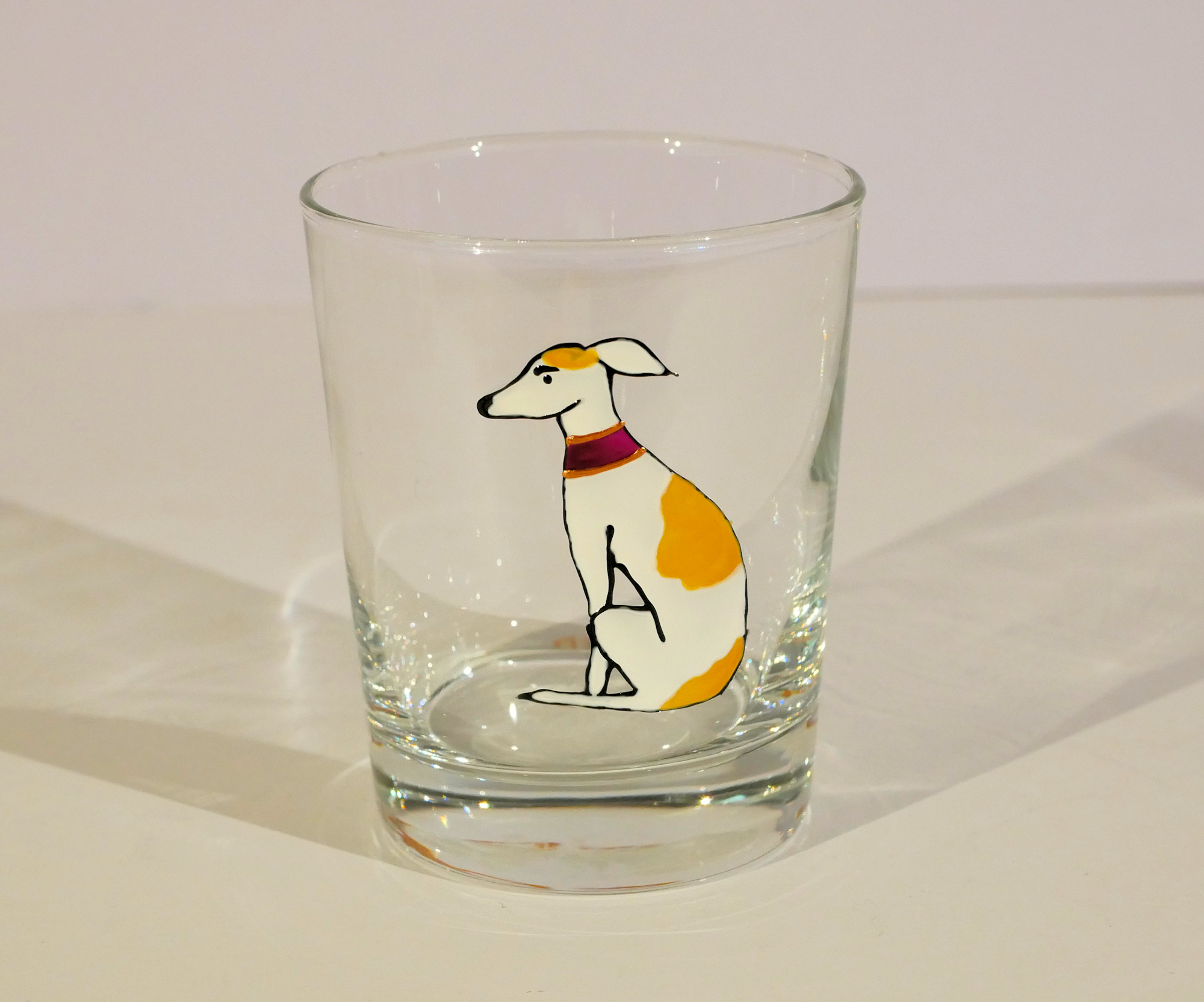 This is one of a range of sitting hounds, on tumblers, pint glasses, pilsner glasses, stemmed or round gin glasses, in a range of hound colours.