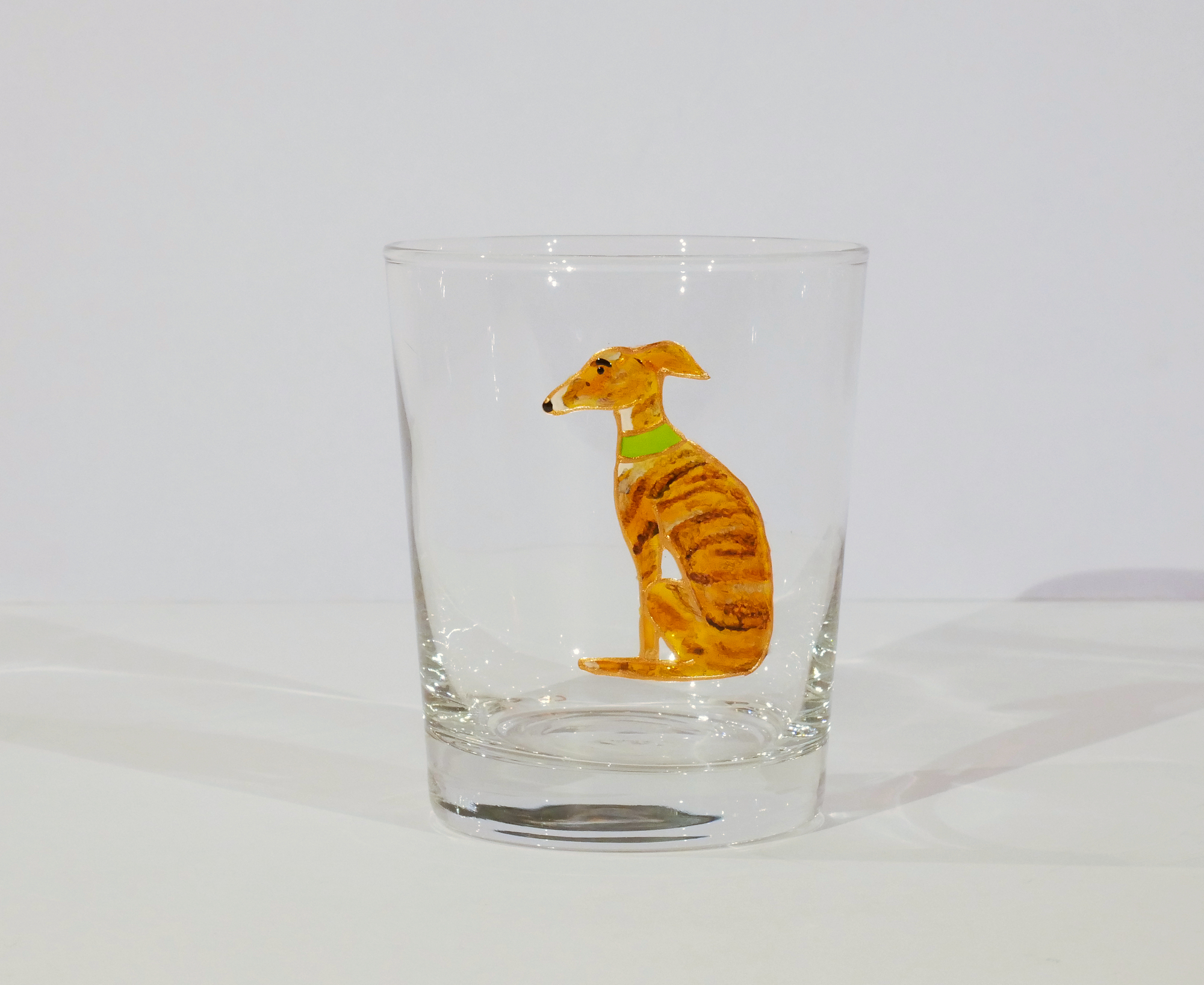 This is one of a range of sitting hounds, on tumblers, pint glasses, pilsner glasses, stemmed or round gin glasses, in a range of hound colours.