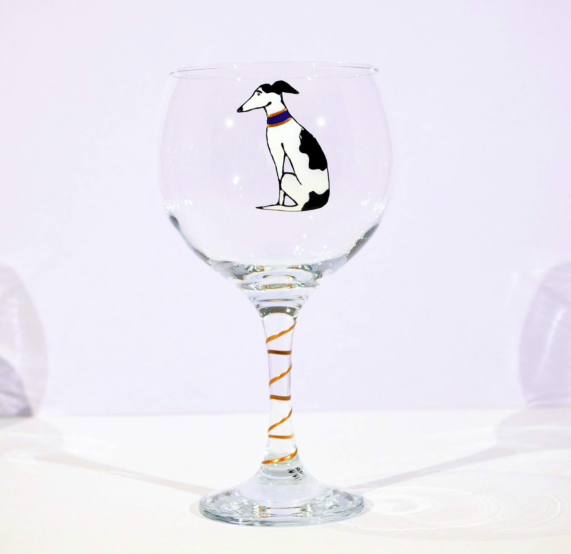 Gorgeous Sitting Greyhound/whippet design on a stemmed gin glass ( 63 cls), with coloured entwined line around the stem. Bowl 10cms high, 11cms wide, glass overall 20cms high. Also suitable as a large wine glass. This design is also available on a round stemless gin glass or pint glass or pilsner.