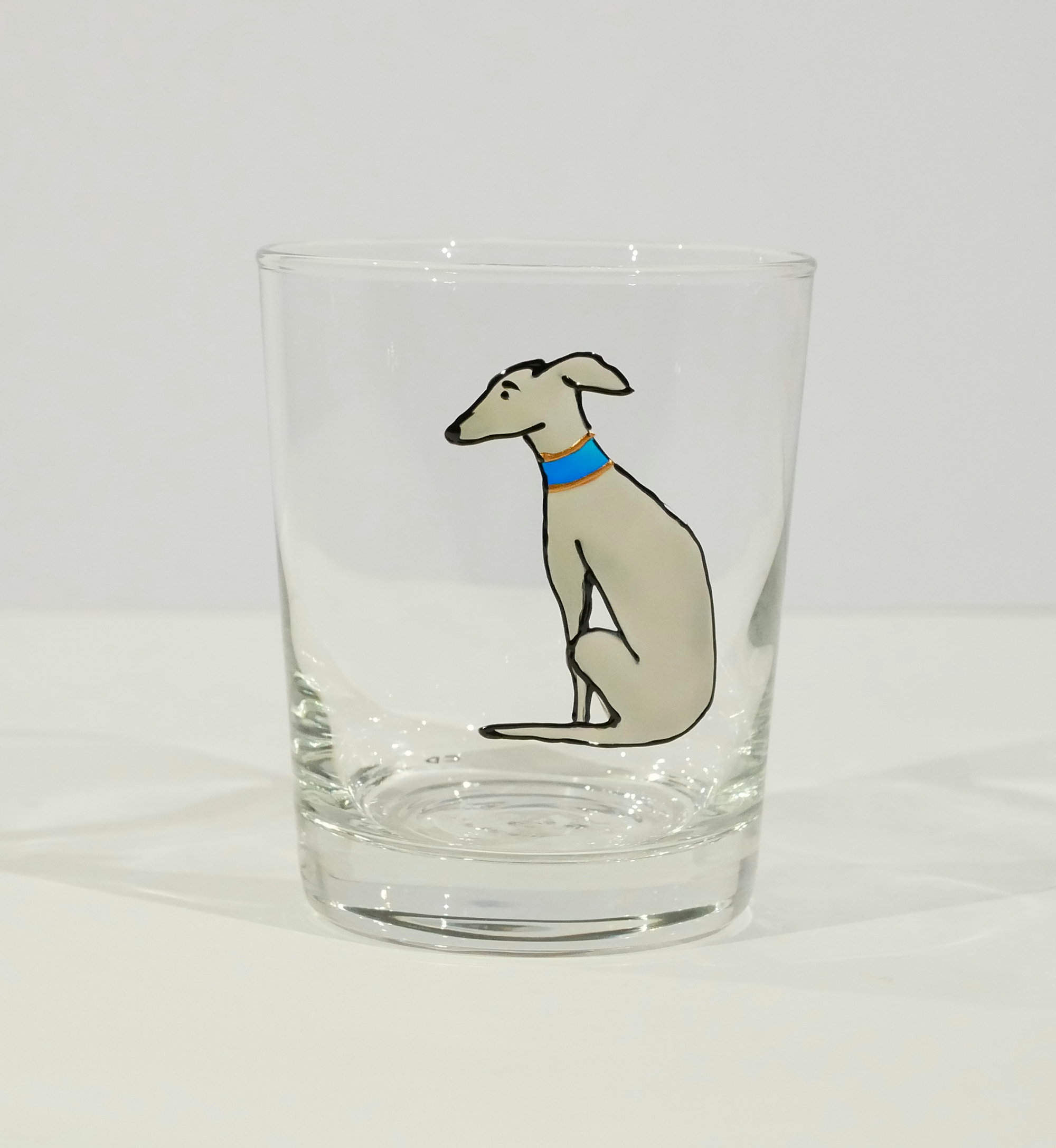 Gorgeous hand drawn and hand painted little greyhound/whippet/lurcher sitting waiting for lunch. Capacity 23cls, 10cms high. Each one individually drawn and painted by us here in Clydach, Wales, and is a piece of art in itself. They are NOT transfers! The glass has been baked so that it is dishwasher safe to 40 centigrade, but we would always recommend hand washing.