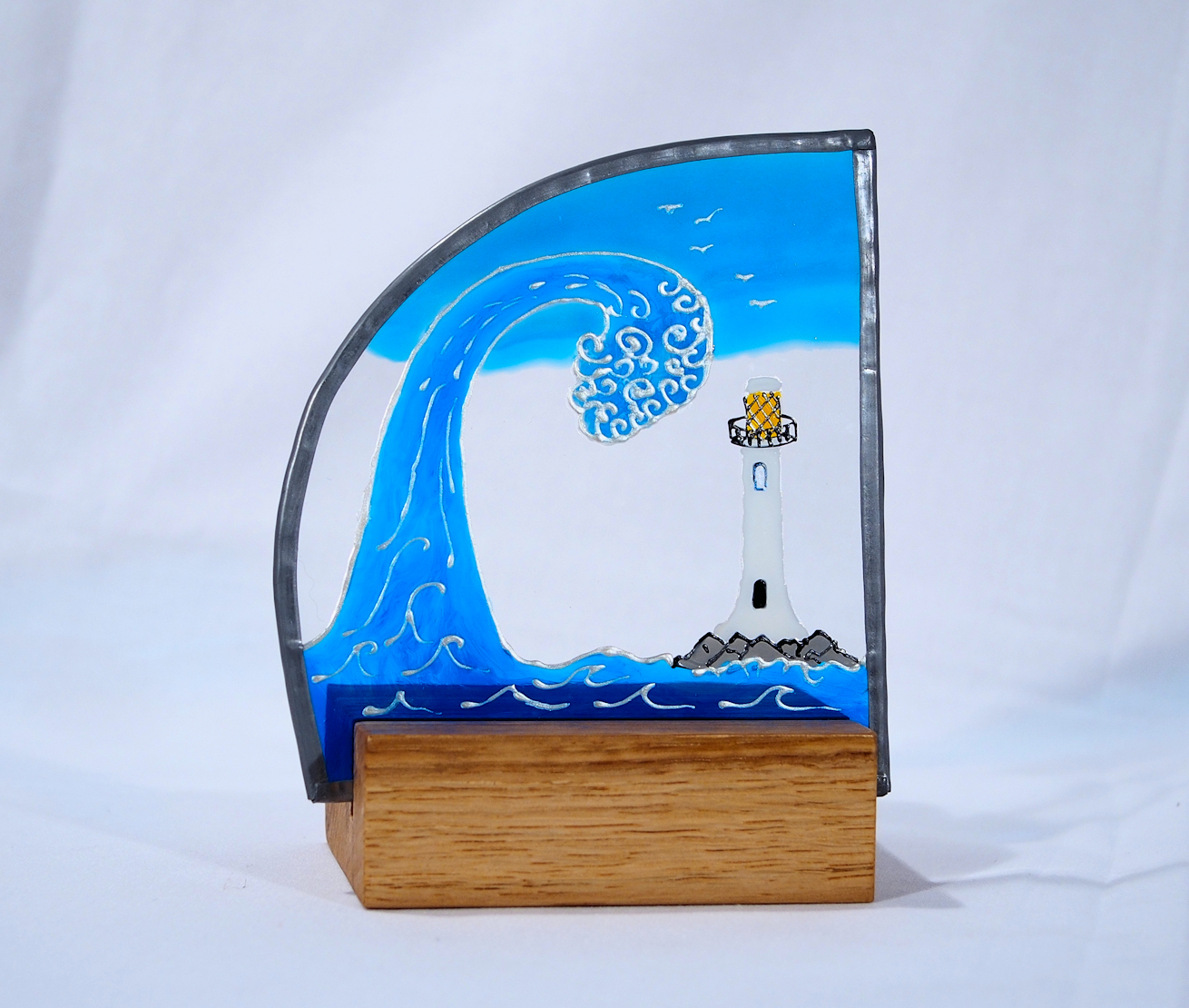 A beautiful curving wave design hand drawn and painted onto glass, the wave curving towards a noble lighthouse. It is inspired by the famous Japanese wave pattern, with a look of the Arts & Crafts movement. This colourful piece of art sits in its hand-made Oak stand and it is 16 cms tall and 12 cms wide.
