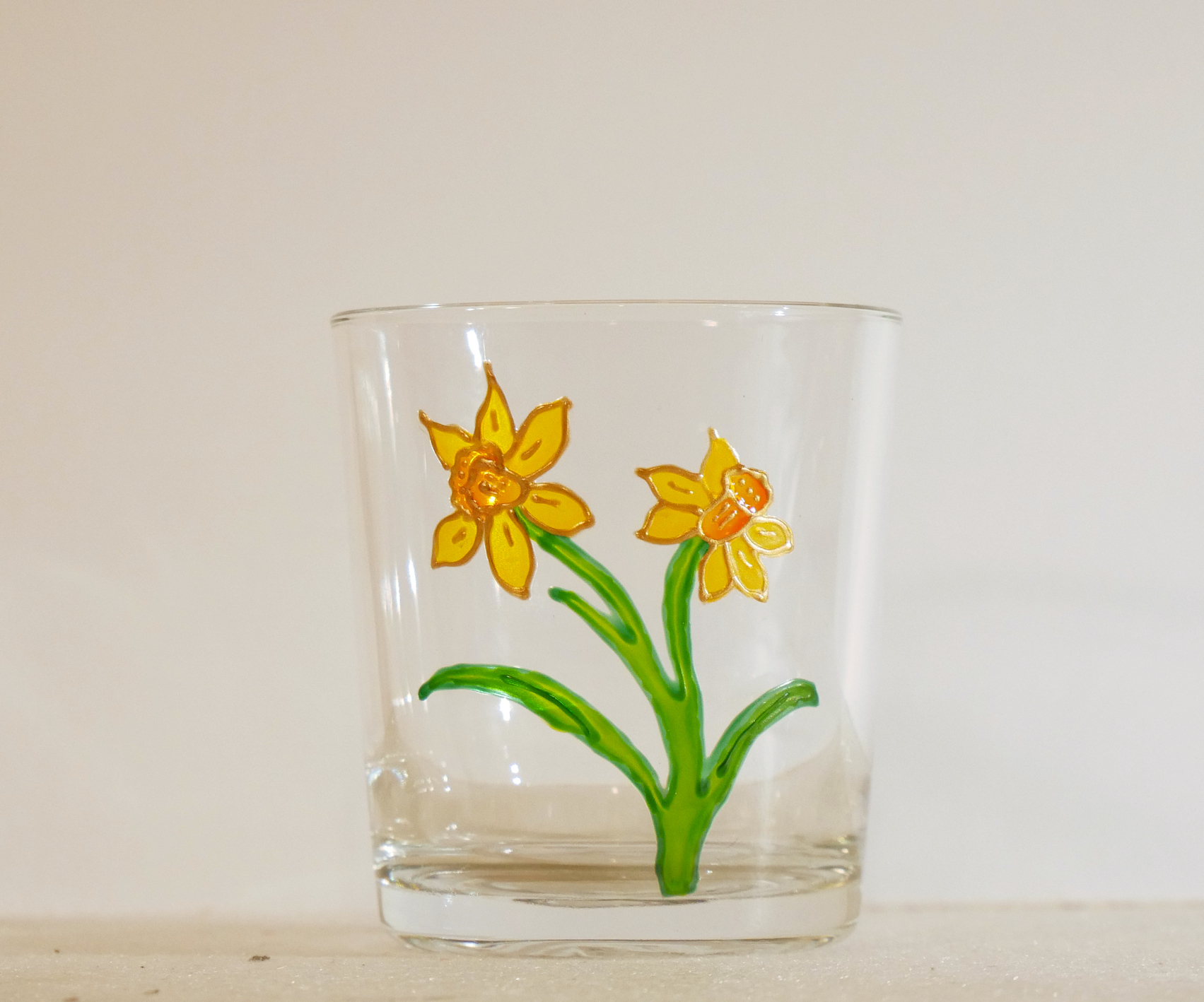 Beautiful handpainted Welsh daffodil, finished in pewter outline. Each one individually drawn and painted and is a piece of art in itself. The glass has been baked so that it is dishwasher safe.