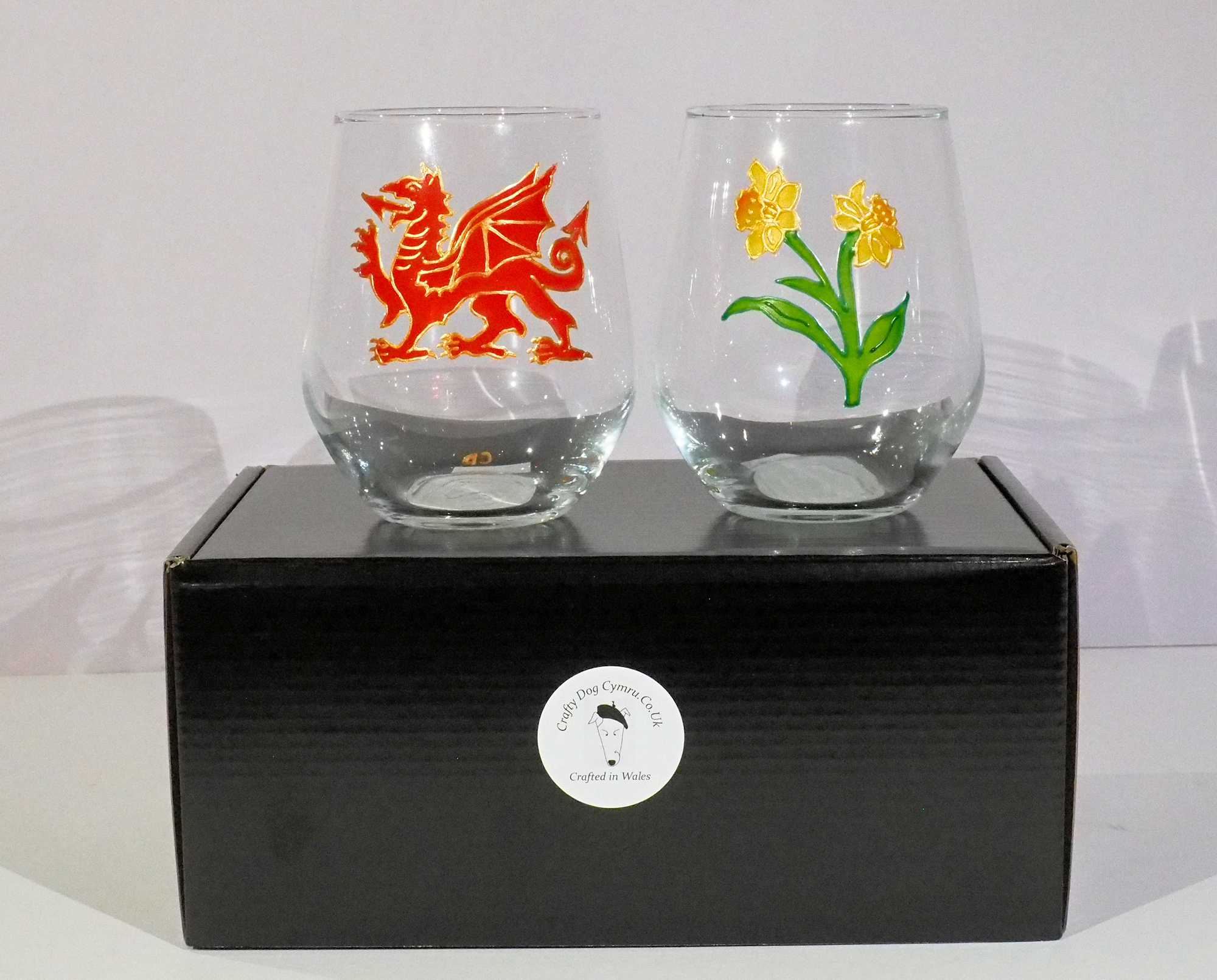 A gift-boxed pair of beautiful hand-drawn and hand-painted Welsh Red Dragon and Welsh Daffodil glasses. They are lovely rounded gin glasses ( 45 cls). 11 cms high. Also suitable as a rum, whiskey or spirits glass. We can export to US/Canada/Europe – please contact us for an accurate postage price. Also avaiable singly and unboxed check out the Welsh Dragon Double Daff or Daffodil/Narcissus round gin glasses.