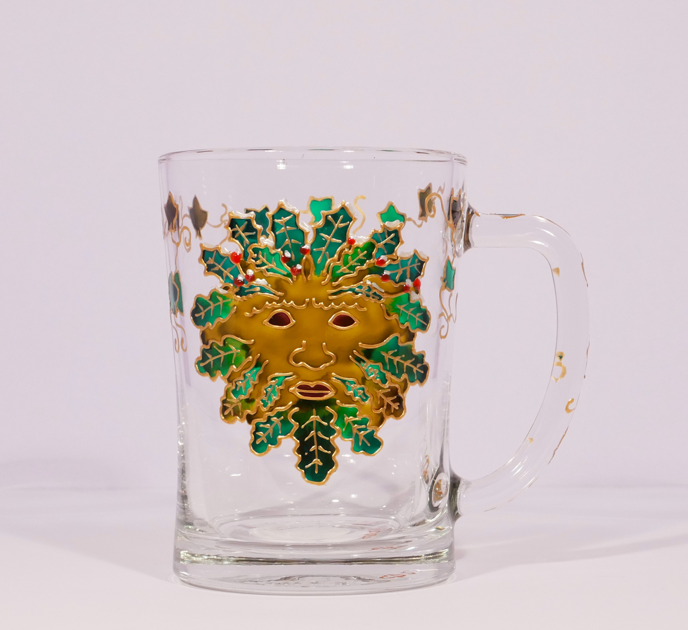 This is a wonderful pint tankard bearing the mystical Green Man of Celtic mythology. Here is the Celtic spirit of nature and woodlands in his Winter garb of browns, dark greens, and wearing a crown of holly leaves and berries, modelled individually on a lovely tankard, lined in gold liner, with leaves detail down the handle. Each one is an individual piece of artwork in its own right.